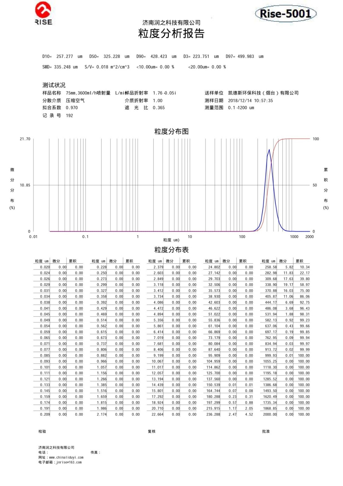輸出報告:輸出報告中有粒度分布曲線和粒度數據圖表,有D10、D50、D90、平均粒徑(SMD)和比表面積等特征參數,另有自定義參數可根據需要自行輸入。
