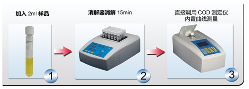 加入2ml樣品→消解器消解15min→直接調用COD測定儀 內置曲線測量
